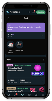Sobald Sie sich von Deutschland aus in Ihr RoyalSea-Konto eingeloggt haben, können Sie auf der Seite „Boni” die verfügbaren Aktionen finden. Je nachdem, für welchen Willkommensbonus Sie sich bei der Registrierung entschieden haben, können Sie ihn hier aktivieren.