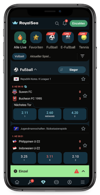 Wir sind beeindruckt von der Live-Wettabdeckung von RoyalSea. Alle Sportarten, für die Live-Spiele angeboten werden, werden im Menü mit einem Banner angezeigt. Fußball, Tennis, MMA, Handball, Boxen, UFC, American Football usw. sind oft die erste Wahl für deutsche Wetter.